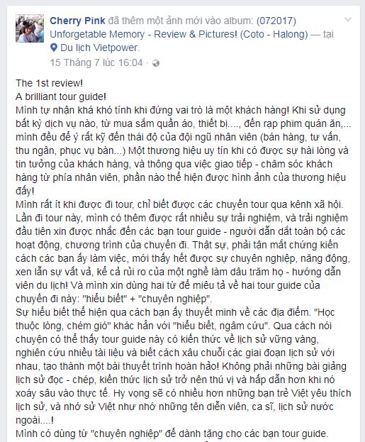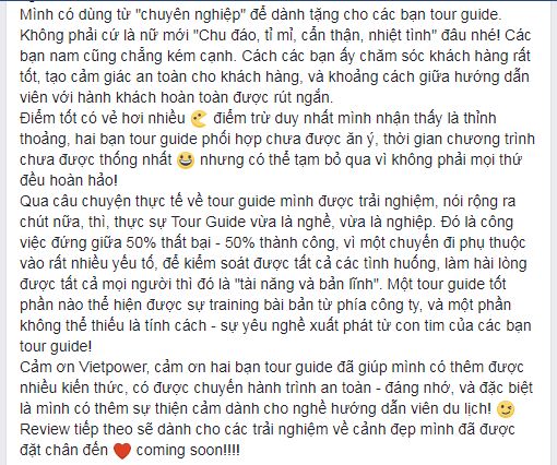Cảm ơn Vietpower, cảm ơn hai bạn tour guide đã giúp mình có thêm được nhiều kiến thức, có được chuyến hành trình an toàn - đáng nhớ, và đặc biệt là mình có thêm sự thiện cảm dành cho nghề hướng dẫn viên du lịch! ![]()