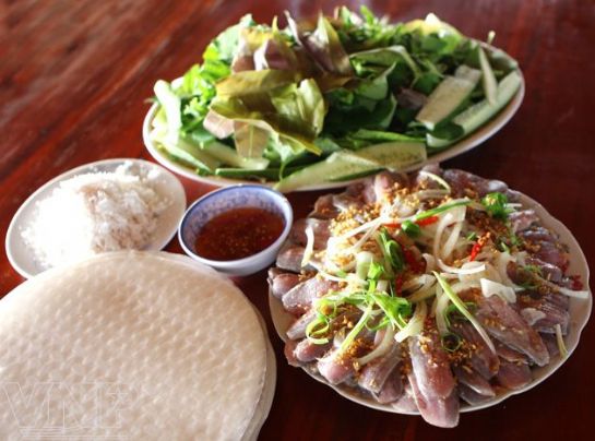 Nhà hàng bê lần lượt từng món chứ không bê tất cả lên một lúc nên món ăn nào cũng nóng, ăn không bị tanh. Tôi đặc biệt ấn tượng với món gói cá trích nhất. Món này được nhà hàng giới thiệu là đặc sản tại Tam Thanh, với những lát cá tươi thái mỏng, nêm thêm gia vị và ăn cùng rau muống biển rất thanh mát và thơm ngon.