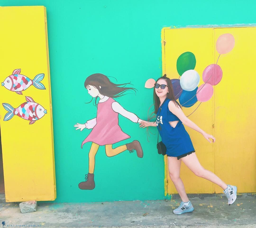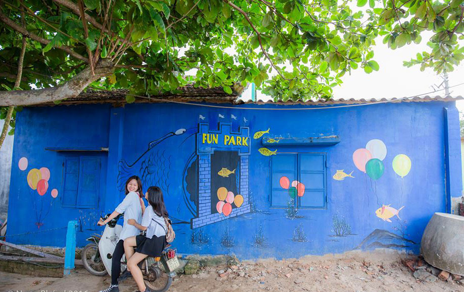 Máy bay hạ cánh tại sân bay Chu Lai, chúng tôi hoàn thành xong thủ tục và bắt taxi đến Tam Kỳ. Cuối cùng, sau gần 4 tiếng cả bay cả đi taxi, thì chúng tôi cũng đã đặt chân đến làng bích họa. Tôi đã vô cùng choáng ngợp bởi những hình ảnh trước mắt. Ngôi làng hiện lên thật êm đềm, bình dị, nổi bật bởi những bức tường đầy màu sắc, mải mê nhìn ngắm sẽ hoa cả mắt.