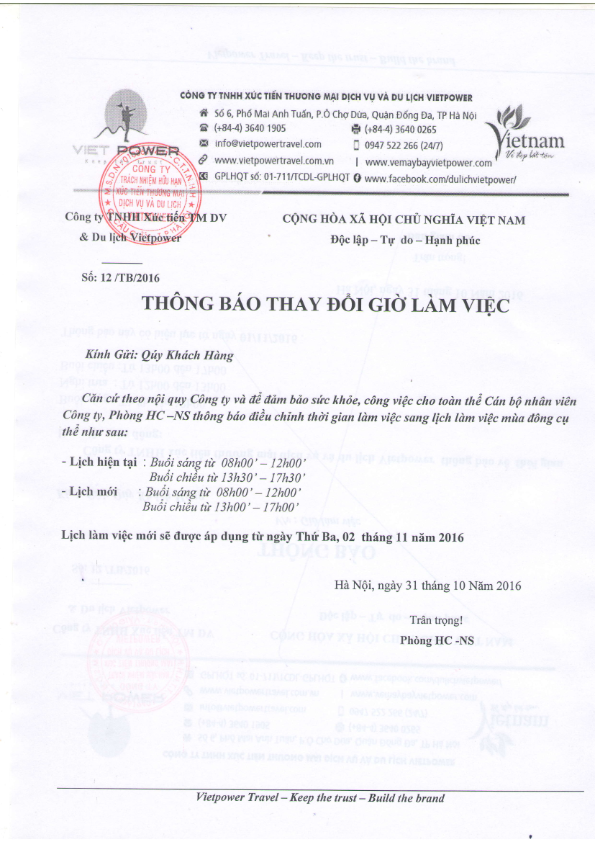 - Công ty Du lịch Vietpower thông báo nghỉ tết dương lịch 2018